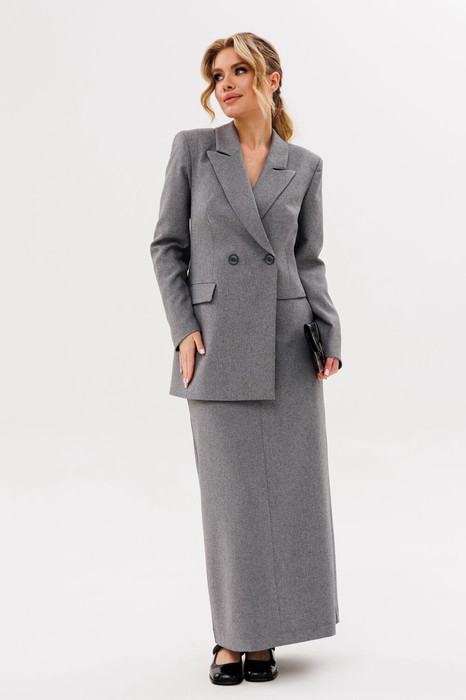 Жакет полуприлегающего силуэта с ассиметричным низом. По переду нагрудная вытачка, переходящая в прорезной карман с клапаном по правой стороне. Двухбортная застёжка на петли-пуговицы.