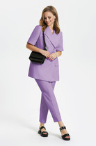 Жакет свободного силуэта с застежкой по переду на кнопки. Воротник отложной. По переду отрезные кокетки, накладной карман с клапаном справа. По спинке кокетка и рельефы. Рукав двухшовный с притачной манжетой на кнопках. Низ жакета на притачном поясе.