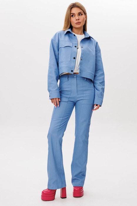 Жакет свободного силуэта с застежкой по переду на кнопки. Воротник отложной. По переду отрезные кокетки, накладной карман с клапаном справа. По спинке кокетка и рельефы. Рукав двухшовный с притачной манжетой на кнопках. Низ жакета на притачном поясе.