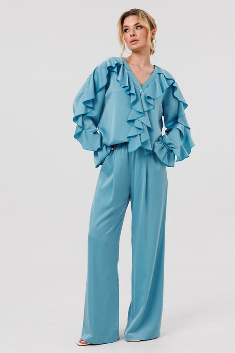 Блузка женская свободного силуэта с застежкой по переду на пуговицы. По переду блузки и по рукавам  декоративные воланы.