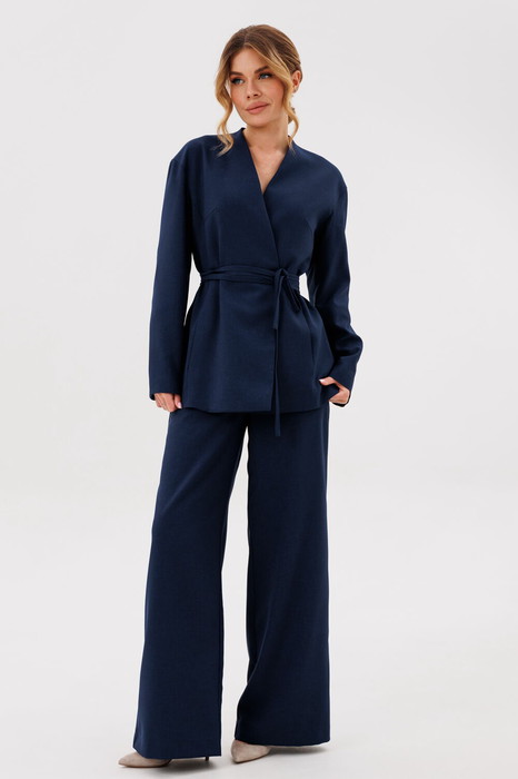 Жакет полуприлегающего силуэта со спущенным плечом и V-образным вырезом. Жакет на подкладке. По переду в рельефах действующие карманы. Застежка на пуговицы. Рукав втачной длинный. Спинка со средним швом и рельефами. Жакет с поясом из основной ткани.