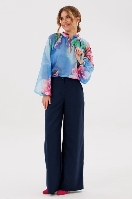 Брюки прямого силуэта на притачном поясе. По переду застежка на тесьму-молнию. По боковым действующие карманы.
