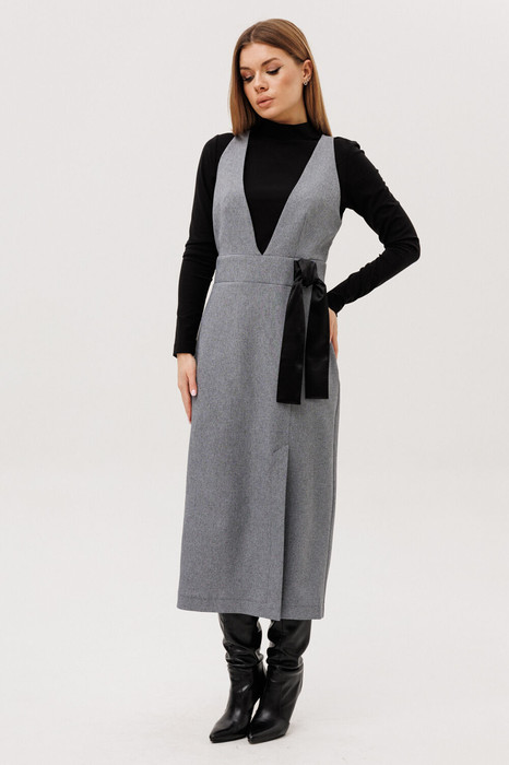 Костюм двухпредметный: Сарафан женский прилегающегосилуэта с V-образным вырезом,вытачками на лифе. На притачном поясе декоративный элемент (БАНТ) ИЗ АТЛАСНОЙ ЧЕРНОЙ ТКАНИ. По переду разрез. На спинке сарафана молния.Длина миди.Изделие на подкладке.Д жемпер женский прилегающего силуэта с втачным одношовным рукавом с  воротником-стойкой.