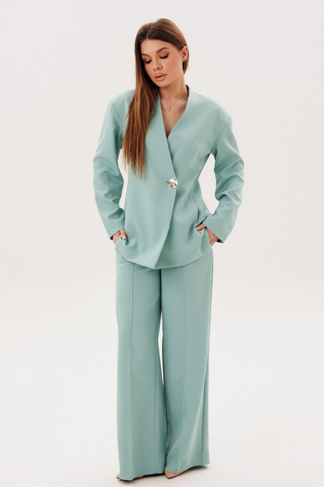 Брюки прямого силуэта дополняют ансамбль, предлагая комфорт и свободу движений. Они оснащены притачным поясом и удобной застежкой на тесьму-молнию спереди. Боковые карманы подчёркивают функциональность брюк.