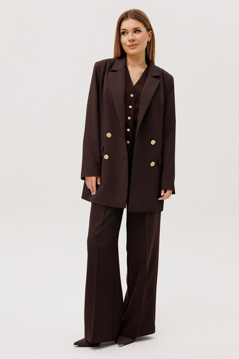 Жакет прямого силуэта, оснащен двухбортной застежкой на петли-пуговицы, что добавляет образу официальности. Детализированный дизайн включает нагрудную вытачку, переходящую в прорезной карман с клапаном на передней части, и фигурный рельеф на спинке с щлицей, обеспечивающий отличную посадку по фигуре. Рукав жакета двухшовный, подчеркивающий линии рук. Жакет на подкладке для дополнительного комфорта.