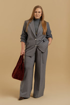 Брючный комплект состоит из блузки и брюк. Блузка из сатиновой ткани очень лёгкая и в тоже время не просвечивается. Втачной рукав по низу манжета с пуговицей, она подворачивается(по желанию).Воротник мужской на стойке.По переду планка на одну пуговицу, с низу блузка завязывается на узел. Спинка свободного силуэта полукруглая,немного длиннее переда. Брюки классические на поясе с резинкой. Застёжка на гульфик и тесьму-молнию.