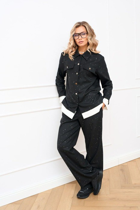 Костюм женский из костюмной ткани состоящий из рубашки и брюк. Рубашка прямого силуэта с центральной застёжкой на петли и пуговицы. Воротник рубашечный, по полочке в области груди настрочены клапаны, фиксирующиеся пуговицами. По низу изделия настрочена контрастная отделка с имитацией двойного изделия по боковым швам с разрезами. Рукав длинный втачной, по низу контрастная отделка, фиксирующаяся на петли и пуговицы.