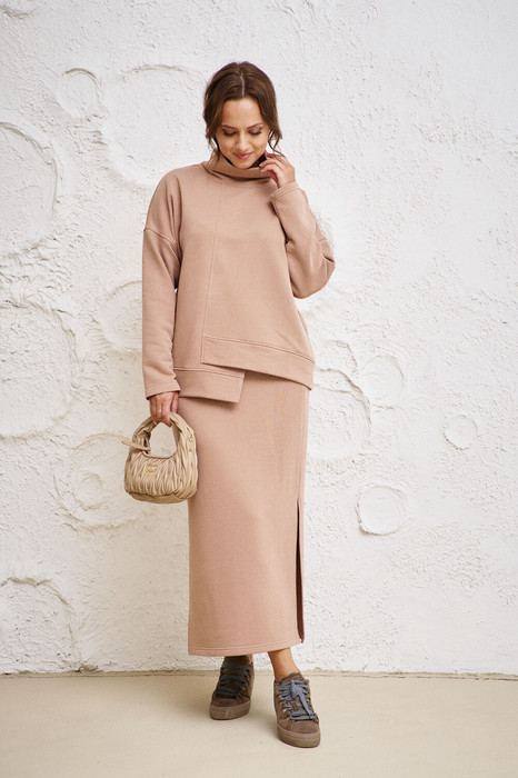 Шикарный трикотажный женский комплект от бренда Anastasia, идеальный для любого случая. Этот костюм сочетает в себе элегантность и комфорт, что делает его подходящим как для деловых встреч или домашней одежды, так и для праздничных мероприятий. Комплект состоит из офисной кофты оверсайз, который придаёт ей особую привлекательность. Нежный и теплый материал делает его отличным выбором для осенне-зимнего периода, при этом он легкий, поэтому его можно носить и весной. Джемпер прямого силуэта со спущенным плечом, низ по полочке фигурный, асимметричный и подрез в виде запаха. По низу спинки и полочки идет отрезной пояс. Юбка макси зауженная к низу, по бокам разрезы, пояс отрезной на резинке. Нарядный костюм отлично подойдет для долгих прогулок или для работы, для офиса. Юбка - макси создает чувственный образ благодаря своей длине, придающей женственность и элегантность вашему образу. Это не только универсальная одежда для деловых встреч или прогулок, но и идеальный выбор для различных торжественных мероприятий, подойдет как для взрослых женщин, так и для подростков. Отдельный части костюма легко будут сочетаться с вещами из Вашего гардероба. Модель можно отнести к стилю спортивный кэжуал, оверсайз, спортивный шик. Костюм можно носить с кроссовками, высокими сапогами или ботинками. Обязательно добавьте наш бренд в избранное и следите за новинками, распродажами, скидками и акциями! Хороших покупок от «Анастасия». Длина блузы (по спинке):(50-54)- 61см, (56-60)-63 см. Длина рукава: (50-60)-45см. Длина юбки: (50-60):-90см.