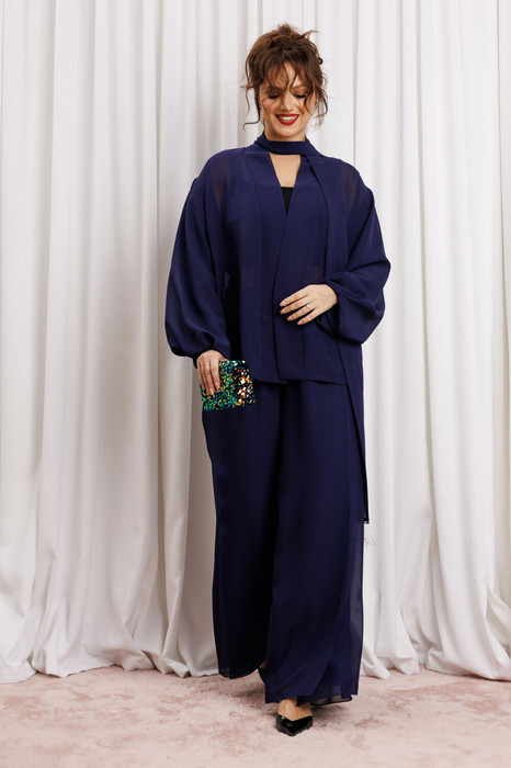 Элегантный вечерний костюм-двойка из шифона, состоящий из блузки свободного кроя и широких брюк. Красивый и эффектный брючный костюм - это идеальный образ для особых случаев, вечерних выходов, праздничных и торжественных мероприятий, будь то корпоратив, свадьба, юбилей, выпускной, день рождения, Новый год Блузка прямого силуэта из шифона со пущенной линией плеча. Рукав двойной, расширенный к низу со складками. По спинке и полочке идет планка. В комплекте с блузкой идет съемный пояс. На концах пояса металлизированная бахрома. Брюки прямые на трикотажной подкладке масло, с запахом по переду, пояс на резинке.Благодаря фасону и крою, костюм визуально вытянет силуэт, сделает фигуру стройнее, подчеркнет ее достоинства, скроет недостатки. Элегантный брючный костюм от Anastasia- комфорт и уверенность в себе на любом мероприятии Длина блузки: (48-56)-61см. Длина рукава-52см. Длина брюк:(48-54)-105см., (56)-108см.