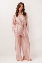 Элегантный вечерний костюм-двойка, состоящий из блузки свободного кроя и широких брюк. Красивый и эффектный брючный костюм - это идеальный образ для особых случаев, вечерних выходов, праздничных и торжественных мероприятий, будь то корпоратив, свадьба, юбилей, выпускной, день рождения, Новый год  Блузка прямого силуэта  со пущенной линией плеча. Рукав двойной, расширенный к низу со складками. По спинке и полочке идет планка. В комплекте с блузкой идет съемный пояс. На концах пояса металлизированная бахрома. Брюки прямые  с запахом по переду, пояс на резинке.Благодаря фасону и крою, костюм визуально вытянет силуэт, сделает фигуру стройнее, подчеркнет ее достоинства, скроет недостатки. Элегантный брючный костюм от Anastasia-   комфорт и уверенность в себе на любом мероприятии Длина блузки: (48-56)-61см. Длина рукава-52см. Длина брюк:(48-54)-105см., (56)-108см.
