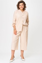 Костюм женский 2-х предметный: жакет и брюки. Жакет полуприлегающего силуэта: бочок с выточкой по полочеке, по спинке средний шов. Застежка двухбортная, карман клапан "обманка". Рукав двухшовный. Брюки прямые .По полочке карман и складки. Пояс на резинке. Длина жакета: 73см . Длина рукава: 62см. Длина брюк: 100 см.