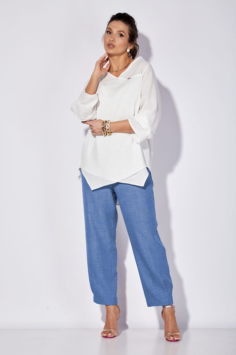 Комплект женский 2-хпредметный (блузка и брюки). Блузка женская из текстильной ткани.  Модель прямого силуэта, рукав углублённый , рубашечного типа. Перед идет с запахом, низ блузы ассиметричный, по полочке углы, спинка закруглённая, удлинённая. По рукаву идут защипы.В качестве декора-логотип фирмы на горловине. Брюки из текстильной ткани, прямые, зауженные к низу за счет защипов. Пояс на резинке, по бокам карманы. Длина по спинке: 80см. Длина рукава: 47см. Длина брюк (48-52) -93см, (54-58)-95см