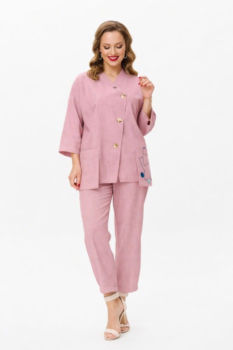Оригинальный женский костюм от бренда Anastasia, идеальный выбор для повседневной носки, офиса и прогулок. Стильный и комфортный костюм сочетает в себе современный дизайн и удобство, что делает его универсальным вариантом на каждый день. Костюм состоит из жакета и брюк. Жакет свободного силуэта, без подкладки, с V-образным вырезом и асимметричной застежкой на пуговицы. По переду расположены накладные карманы, один из которых дополнен декоративным принтом. Рукав втачной, длиной 3/4, линия плеча слегка спущена, что добавляет образу легкости и актуальности. Брюки прямого силуэта, укороченные, со средней посадкой. Пояс комфортный, обеспечивает удобную посадку и свободу движений. Крой брюк визуально вытягивает силуэт и подходит для разных типов фигуры. Пояс на резинке, по бокам карманы. Стильный женский костюм отлично подойдет для офиса, прогулок, путешествий и повседневной носки. Отдельные элементы костюма легко сочетаются с другими вещами гардероба. Длина спинке:(48-52)-70см. Длина рукава:(48-52)-33см. Длина брюк (48-50) -93см, (52)-95см