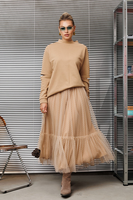 Оригинальный женский комплект от бренда Anastasia, идеальный для любого случая. Этот костюм сочетает в себе элегантность и комфорт, что делает его подходящим как для повседневной носки, так и для праздничных мероприятий. Джемпер оверсайз из трикотажного полотна. Прямого силуэта со спущенным плечом. Воротник-стойка. По рукаву идет подрез с разрезом. Низ рукава и низ джемпера - на манжете. Джемпер лекго сочетается с любыми низами: брюки, джинсы, юбка. Юбка макси из 2-х видов ткани: верх с отрезным валаном из фатина, подкладка юбка солце из шифона. Пояс на декоративной резинке. Фасон универсален, а использование резинки на поясе повышает комфортность носки, позволяя юбке адаптироваться под индивидуальные особенности фигуры. Юбку легко сочетать с различными верхами: топ, блузка, футболка, кружевной жакет, свитер или жакет из тексиля - все это позволит создавать различные образы на разные случаи. Длина по спинке 68см. Длина рукава (с манжетой): 60см. Длина юбки: 90 см