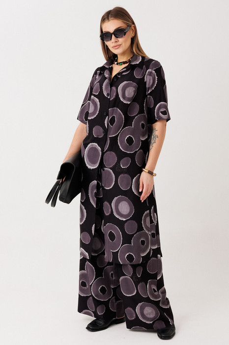 Костюм женский 2-х предметный (блузка, брюки) из легкой хлопковой ткани. Шикарный, стильный женский костюм от бренда Anastasia, идеальный для любого случая. Этот костюм сочетает в себе элегантность и комфорт, что делает его подходящим как для деловых встреч или домашней одежды, так и для праздничных мероприятий.  лузка длинная, прямая. По переду нагрудные выточки с проймы. По боковым швам разрезы. Воротник на отрезной стойке, застежка планка на петли и пуговицы.Рукав втачной одношовный. Брюки-палаццо прямые широкие,  пояс на резинке, по низу широкая подгибка. Имеет оригинальный и современный крой, придающий образу особую изысканность. Брюки палаццо, благодаря своему поясу на резинке, могут растягиваться до большого размера, поэтому подходят для любой фигуры, будь то девочка-подросток или взрослая женщина. Длина блузки: (50-54)-112 см., (56-62)-114 см. Длина рукава: (50-54)-32 см., (56-62)-34 см. Длина брюк: (50-54) - 102 см, (56-62) - 105 см