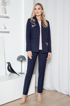 Брюки классические, прилегающие в области бедер, свободные в колене и немного зауженные к низу. По передним половинкам выполнены наклонные карманы, в среднем шве застежка на молнию. По задним половинкам выполнены талиевые вытачки. Брюки на притачном поясе с эластичной тесьмой и застежкой на петлю и пуговицу. Брюки со стрелками