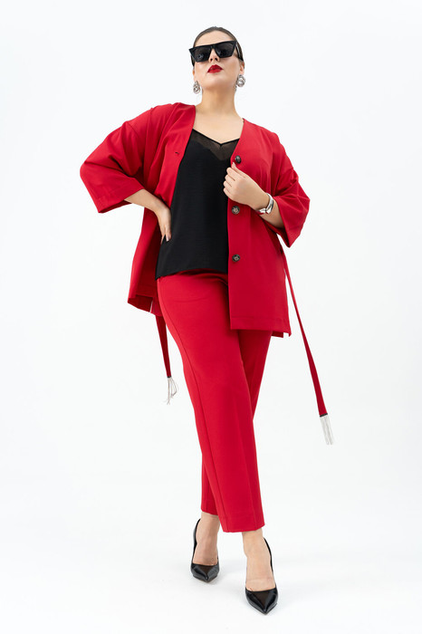 Костюм женский на  любые  мероприятия,  состоящий из жакета,брюк и топа.  Жакет  прямого  силуэта, с v-образным вырезом горловины,  со   спущенными плечами,  на центральной застёжке на петли и пуговицы, со съёмным поясом на концах с металлической бахромой, . по боковым швам обработаны разрезы . спинка с отрезной кокеткой. Брюки классические 7/8, на притачной поясе,  с застёжкой на тесьму-молнию, с отстроченным кантом по передним половинкам, с боковыми наклонными карманами, по спинке резинка. Топ прямого силуэта с нагрудными вытачками и с разрезами по боковым швам. Блузка-топ с регулирующей  с ругулирующей фурнитурой. По вырезу горловины вставка из сетчатого материала.