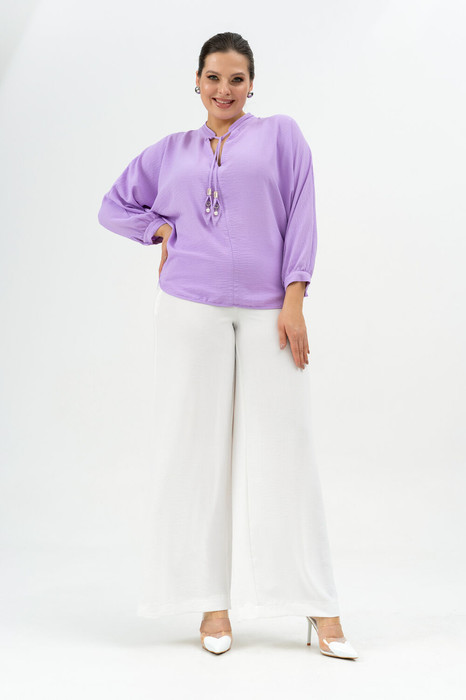 Костюм женский для любого мероприятия.  Блузка женская  как для праздников так и для любого повода, , покроя "летучая мышь" , со стойкой на которую настрочена завязка с декоративными  элементами , со швом по центру полочки, рукава цельнокроёные, застёгивающиеся на петлю и пуговицу. Низ блузки  по спинке длиннеее, по полочке короче.  Брюки женские, прямого силуэта  на притачном поясе по полочке и   с резинкой по спинке.