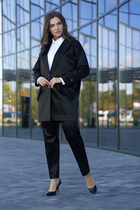 Костюм женский двойка, состоящий из удлиненного жакета и брюк, выполнен из смесовой хлопчатобумажной ткани.