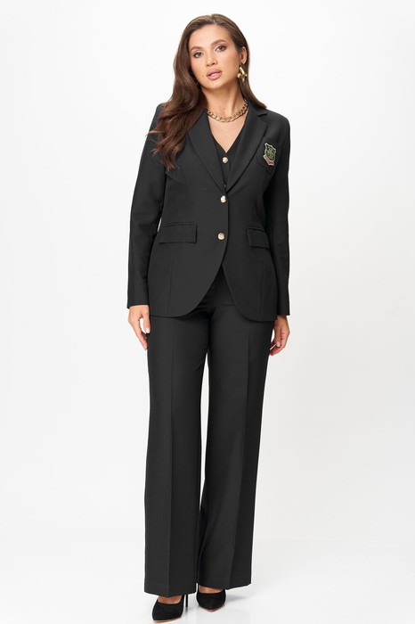 Жакет с застёжкой спереди на петли и пуговицы, с пиджачным воротником и втачными двухшовными рукавами. По переду выполнены боковые прорезные карманы с клапанами и нагрудный накладной карман с нашивкой, спинка со швами.