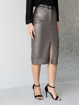 Юбка карандаш металлик средней длины с разрезом из эластичного денима