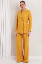 Кроп-жакет с рукавами 3/4 становится лёгким завершающим акцентом, придавая комплекту завершённость и позволяя чувствовать себя комфортно в течение всего дня. Пояс на кулиске мягко регулирует посадку, а аккуратная декоративная листочка добавляет деликатную деталь, подчеркивающую продуманность дизайна.