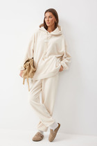 Брюки продолжают философию комфорта, предлагая прямую посадку на эластичном поясе, который мягко сидит по фигуре, не стесняя движений. Лаконичный дизайн дополнен практичными боковыми карманами. Подлинной изюминкой всего комплекта становятся намеренно открытые срезы, привносящие в образ ноту дерзкого шика.