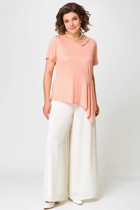 Базовый брючный комплект состоит из оригинальной блузки и широких брюк-палаццо. Блузка из тонкого однотонного трикотажного полотна с элегантными защипами по талии подчеркнет Вашу женственность и романтичность. Удлиненную блузку дополняют комфортные брюки свободного силуэта из струящегося шифона, которые помогут скрыть недостатки и вытянуть фигуру.