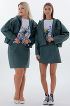 Комплект выполнен из плотной ткани состоит из жакета и шорт. Характеристики жакет: укороченный, подкладка, подплечники, застежка центральная смещенная вниз, рукав втчаной, остроугольный лацкан, прорезное кармашек по переду жакета, спинка цельнокроеная;