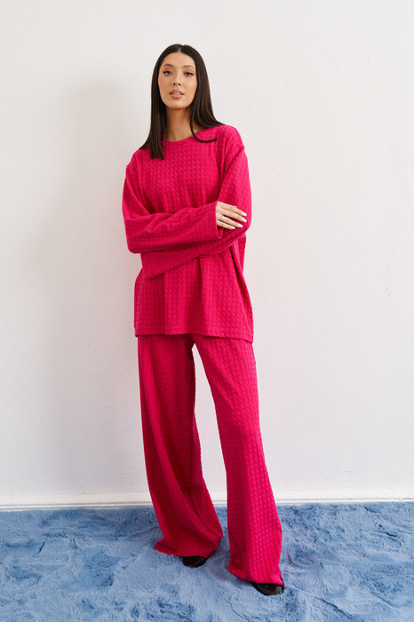 Уютный комфортный комплект выполнен из фактурного трикотажного полотна розового цвета состоит из джемпера и брюк. Характеристики: джемпер прямого свободного кроя, горловина овальная, рукав спущен. Длина джемпера 74 см, длина рукава 61 см. Брюки прямого свободного кроя, пояс брюк на резинке, в боковых швах карманы. Длина брюк 110 см