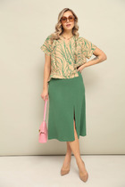 Комплект состоящий из рубашки и брюк выполнен из трикотажного полотна с геометрическим принтом.Характеристики: рубашка прямого свободного кроя, воротник классический - отложной, застежка центральная на петли пуговички, по переду крупные карманы, рукав спущен, в боковых швах разрезы, спинка цельнокроеная. Длина рубашки по спинке 73 , длина рукава 68 см от края горловины. Брюки прямого свободного кроя, пояс на резинке, в боковых швах карманы. Длина брюк 99 см.