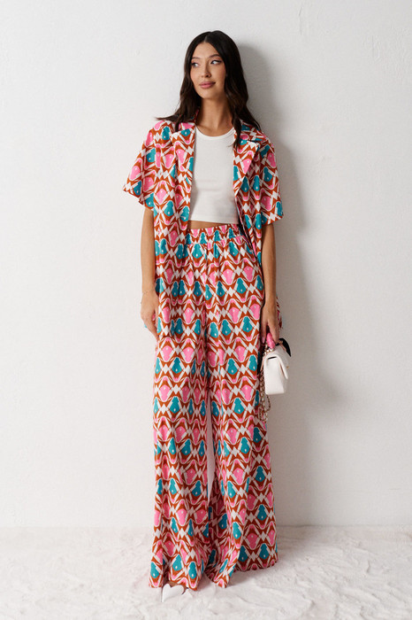 Комплект состоит из рубашки и брюк выполнен из хлопкового полотна с абстрактным ярким принтом. Характеристики: Рубашка прямой крой, отложной воротник, застежка центральная на петли пуговицы, по низу накладные крупные карманы, рукав втачной. Длина по спинке 74 см, длина рукава 25 см. Брюки прямого кроя, пояс брюк на резинке, в боковых швах карманы. Длина 114 см.