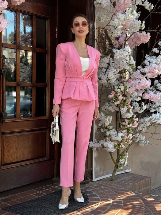 Костюм 2-хпредметный. Жакет приталенного силуэта, обработан подкладкой. Отрезной по линии талии, декорирован пришитым поясом по линии талии. Низ изделия обработан баской, собранной в складку. Рукав длинный, вачной. Окат рукава обработан вставкой для удлиннения плечевого шва. Перед жакета обработан сборкой. Брюки прямого кроя, длинна 7/8, застёжка- гульфик , по боковым швам обработаны карманы