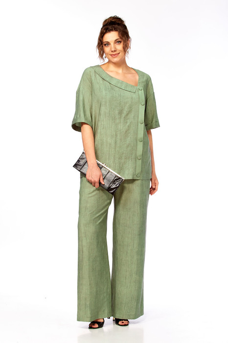 Комплект женский брючный, состоящий из блузы и брюк.Блуза свободного покроя до уровня бёдер с рукавом на спущенной пройме, рукав до локтя с отложной манжетой по низу. Вырез горловины ассиметричный V- образный, с воротничком, слева по переду планка с пуговицами от горловины до низа изделия, спинка цельная прямая. Брюки свободные, широкие на поясе с эластичной тесьмой, с боковыми карманами.