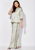 Брюки классические, слегка расширенные книзу, на поясе-кокетке, со стрелками, застежка спереди на молнию и пуговицу, по передним половинкам боковые карманы.