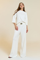 Комплект женский состоящий из блузки и юбки. Блузка прилегающего силуэта, отрезная по линии талии, вырез горловины-круглый, рукав 3/4 со складками по окату, застежка по спинке на пуговицы, изделие на подкладке, со съемным посом. Юбка прямая, зауженная к низу, на обтачке, застежка сзади на молнию, в среднем шве заднего полотнища-шлица, изделие на подкладке.