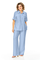 Комплект женский брючный, состоит из жакета и брюк. Жакет укороченный, прилегающего силуэта, воротник отложной с лацканами, рукав втачной, застёжка спереди на петли и пуговицы, по переду карманы с клапанами "обманка", по спинке рельефы и средний шов, изделие на подкладке. Брюки широкие со складками от пояса, застёжка спереди на молнию и пуговицы, с боковыми карманами.