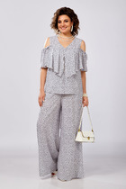 Комплект женский состоящий из жакета и брюк. Жакет прилегающего силуэта с застёжкой спереди на пуговицы, с отложным воротником с лацканами, с фигурным подрезом по переду и спинке и вставкой из сетки, с карманами по переду, с втачным рукавом. Изделие на подкладке. Брюки узкие, на поясе-кокетке, с застёжкой спереди на молнию и пуговицы, с боковыми карманами и стрелками.