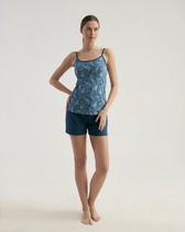 Комплект женский, состоящий из жакета, жилета, брюк-бермудов. Жакет прямого силуэта с втачным рукавом, свободный, с отложным воротником с лацканами с застёжкой на пуговицу, с карманами по переду, на подкладке. Жилет прилегающего силуэта с вертикальными рельефами по переду и спинке, с застёжкой спереди на пуговицы, на подкладке. Брюки- бермуды на поясе, свободные со складками по передним половинкам, с боковыми карманами, длина за колено.