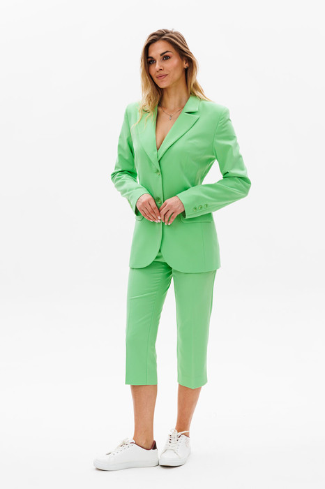 Комплект женский, состоящий из жакета и брюк-капри. Жакет прилегающего силуэта с застёжкой спереди на петли и пуговицы, с воротником отложным с лацканами, с карманами по переду, с втачным рукавом. Изделие на подкладке. Капри длиной за калено, узкие на поясе, с застёжкой спереди на молнию и пуговицы, с карманами, с разрезиками по низу боковых швов.