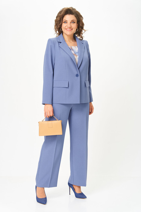 Женский трёхпредметный комплект состоит из жакета и брюк, выполненных из однотонной плательно-костюмной ткани и блузы,выполненной из сатина с оригинальным дизайном.