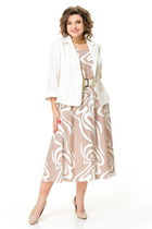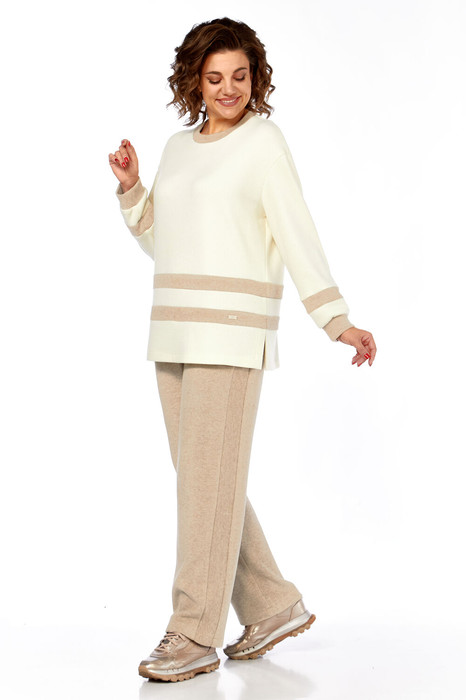 Джемпер прямого силуэта удлинённый с разрезами по бокам. Плечи слегка спущены. Рукава одношовные, длинные, низ на двойных притачных манжетах.Круглый вырез горловины обработан двойной бейкой. Джемпер выполнен из молочного трикотажного полотна в мелкий рубчик со вставками-полосками по переду, спинке и рукавам из трикотажного полотна в цвет брюк. По переду декоративная пластинка.