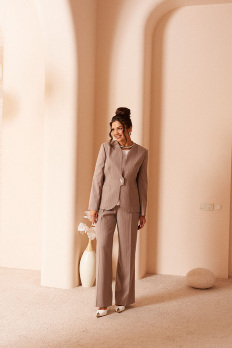 Комплект женский 3-ка, состоящий из жакета, брюк и блузки. Предназначен для повседневного использования. Жакет и брюки выполнены из костюмной ткани высокого качества нежной фактуры, приятной на ощупь, и актуального дизайна в полоску. Блузка изготовлена из вискозного полотна с содержанием натуральных волокон.