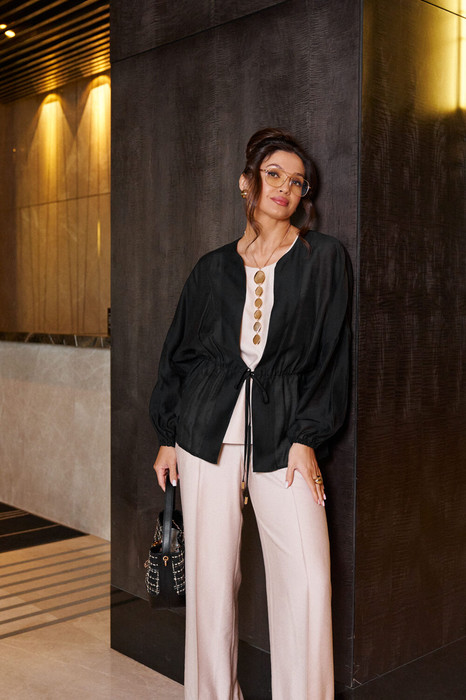 Блузка свободного силуэта с фиксацией по талии на завязки с декоративными наконечниками.