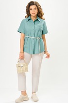 Комплект женский-двойка, из текстильной ткани, жакет удлиненный, полуприлегающего силуэта с центральной бортовой застежкой на пуговицы до линии перегиба лацкана. Спереди рельефные швы от плечевого шва, отрезной бочок и карман с клапаном. Спинка с рельефами от плечевого шва. Рукав втачной, двухшовный. Воротник пиджачного типа. Жакет на подкладке, длина по спинке 67 см, длина рукава 62 см. Брюки прямые,классические, с заутюженными стрелками,по переду обработаны карманы с отрезным бочком,застежка на тесьму-молнию и 1 пуговицу.На задних половинках обработаны вытачки и имитация карманов с листочкой, пояс в брюках притачной. Длина брюк от талии по боковому шву 100 см.