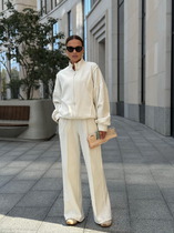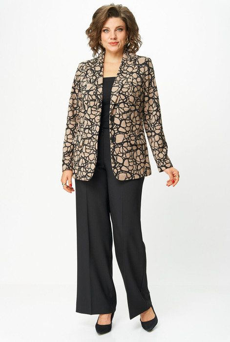 Комплект женский-двойка, из текстильной ткани, жакет женский удлиненный, из трикотажной ткани, перед жакета на подкладке, полуприлегающего силуэта с центральной бортовой застежкой на пуговицы до линии перегиба лацкана. Спереди рельефные швы от плечевого шва, отрезной бочок и карман с клапаном. Спинка с рельефами от плечевого шва. Рукав втачной, двухшовный. Воротник пиджачного типа. Длина по спинке 70, длина рукава 61. Брюки-палаццо,средней ширины,из плотной текстильной ткани, выполнены с карманами с отрезным бочком в боковом шве. Пояс притачной, застёжка на молнию. По задним половинкам обработаны вытачки. Длина по боковому шву 108 см.