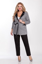 Комплект 2-х предметный состоит из жакета и и брюк. Жакет женский удлиненный, из текстильной ткани, на подкладке, полуприлегающего силуэта с центральной бортовой застежкой на пуговицы до линии перегиба лацкана. Спереди рельефные швы от плечевого шва, отрезной бочок и карман с клапаном. Спинка с рельефами от плечевого шва. Рукав втачной, двухшовный, по низу рукава обработана шлица на петли-пуговицы. Воротник пиджачного типа. Длина по спинке 66 см, длина рукава 62 см. Брюки-палаццо,средней ширины,из плотной текстильной ткани, выполнены с карманами с отрезным бочком в боковом шве. Пояс притачной, застёжка на молнию. По задним половинкам обработаны вытачки. Длина по боковому шву 108 см.