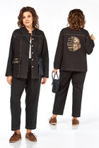 Комплект 2-х предметный состоит из блузы и и брюк. Блуза женская, прямого силуэта из текстильной ткани. Воротник отложной, застежка центральная на петли-пуговицы. По переду нагрудные вытачки и настрочены накладные карманы. Спинка цельная. Рукав втачной, одношовный, 3/4, с притачной манжетой. В боковых швах по низу небольшие разрезы. Длина по спинке 74 см, длина рукава 45. Брюки классические,из текстильной ткани, прямые, слегка заужены к низу,заутюжены стрелки,по переду обработаны карманы с отрезным бочком,застежка на тесьму-молнию и 1 пуговицу.На задних половинках обработаны вытачки и имитация карманов с листочкой, пояс в брюках притачной. Длина брюк от талии по боковому шву 105 см.