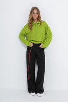 Комплект женский, 2-х предметный, состоит из блузы и и брюк. Блуза женская, прямого силуэта из текстильной ткани. Воротник отложной, застежка центральная на петли-пуговицы. По переду нагрудные вытачки и настрочены накладные карманы. Спинка цельная. Рукав втачной, одношовный, 3/4, с притачной манжетой. В боковых швах по низу небольшие разрезы. Длина по спинке 74 см, длина рукава 45. Брюки-палаццо, средней ширины, из текстильной ткани, выполнены с карманами с отрезным бочком в боковом шве. Пояс притачной, на резинке по боковым швам, застёжка на молнию. По задним половинкам обработаны вытачки. Длина по боковому шву 108 см.