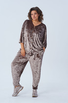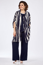 Комплект 2-х предметный из хлопковой ткани, состоит из жакета и и брюк. Жакет женский удлиненный, полуприлегающего силуэта с центральной бортовой застежкой на пуговицы до линии перегиба лацкана. Спереди рельефные швы от плечевого шва, отрезной бочок и карман с клапаном. Спинка с рельефами от плечевого шва. Рукав втачной, двухшовный, 3/4, с небольшим разрезом в локтевом шве. Воротник пиджачного типа. Перед жакета на подкладке. Длина рукава 50, длина по спинке 68 см. Классические брюки, прямые, слегка заужены к низу,заутюжены стрелки,по переду обработаны карманы с отрезным бочком,застежка на тесьму-молнию и 1 пуговицу.На задних половинках обработаны вытачки и имитация карманов в рамку с двумя обтачками,пояс в брюках притачной. По низу брюк в боковом шве есть небольшой разрез. Длина брюк от талии по боковому шву 93 см.